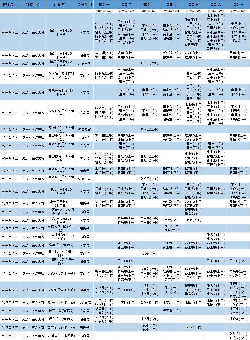 和平路院区皮肤、医疗美容系统门诊排班表