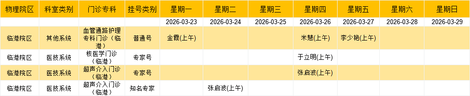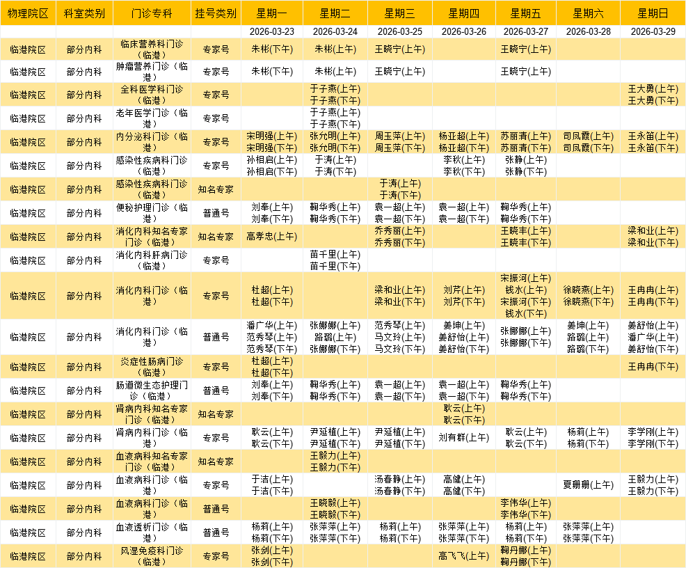 临港院区内科门诊排班表