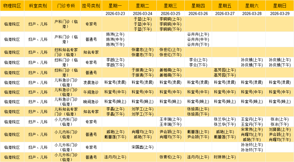 临港院区妇产、儿科门诊排班表