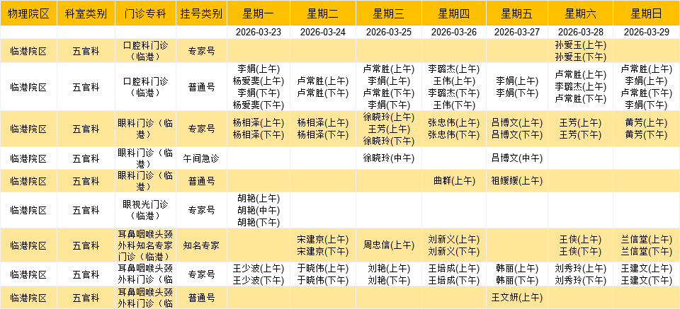 临港院区五官系统门诊排班表