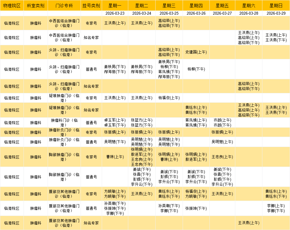 临港院区肿瘤系统门诊排班表