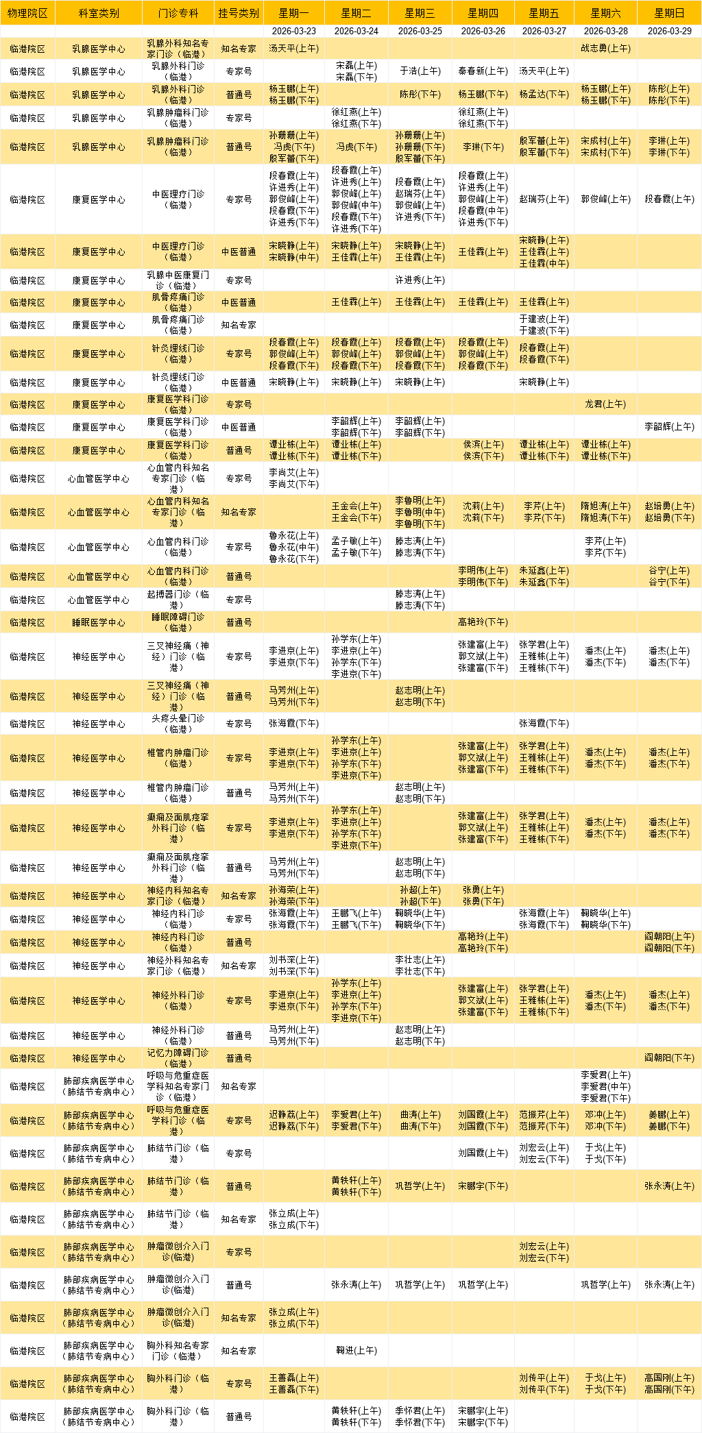 临港院区医学中心门诊排班表