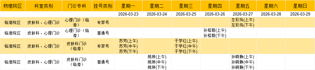临港院区皮肤、心理门诊排班表