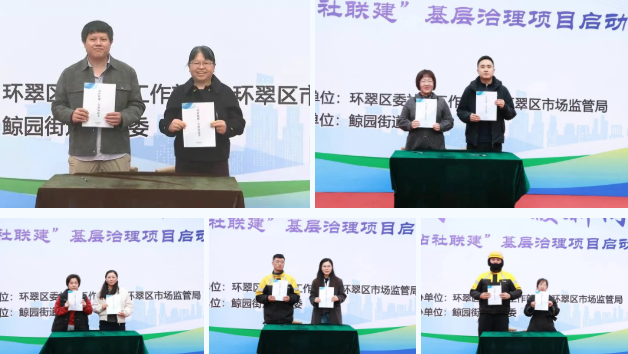 仪式现场,大世界片区北门外、古北、长征、光明4个社区及至海港湾商圈,分别与淘宝闪购、美团外卖、圆通快递、滴滴网约车等辖区新就业群体站点负责人签订共建协议。一纸协议凝聚三方合力,标志着鲸园街道“站点+社区+商圈”基层治理新模式正式落地,三方携手开启党建引领、暖新共治的基层治理新篇章。