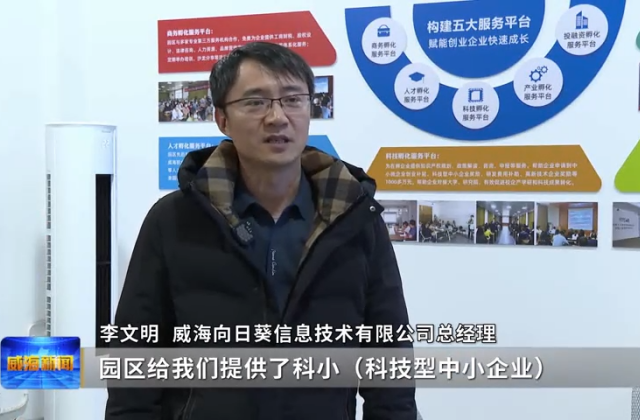 威海向日葵信息技术有限公司总经理李文明说,园区给他们提供了科技型中小企业、国家高新技术企业这种申报服务,从知识产权的指导到材料的准备,到最后进行申报,帮他们高效通过了高新技术企业认定。