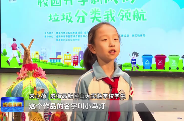 威海高新区山大实验学校学生宋心荷说,这个作品的名字叫小鸟灯,主要材料有热缩片、木棍、不要的塑料瓶等,她认为垃圾分类非常重要,她以后一定会坚持做垃圾分类。