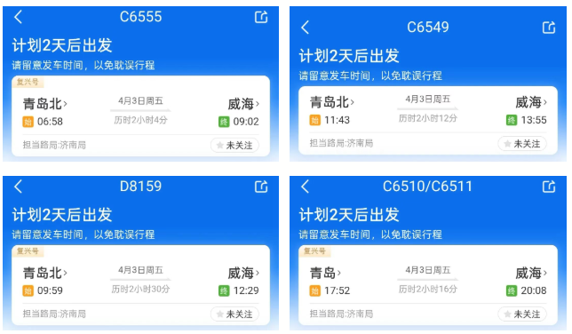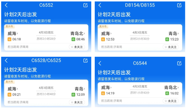 新增具体车次及时刻如下:威海站至青岛北站C6552次,6:18发车、8:46抵达;威海站至青岛站C6528次,9:21发车、12:09抵达;威海站至青岛站D8154次,12:53发车、15:23抵达;威海站至青岛北站C6544次,14:19发车、16:02抵达。