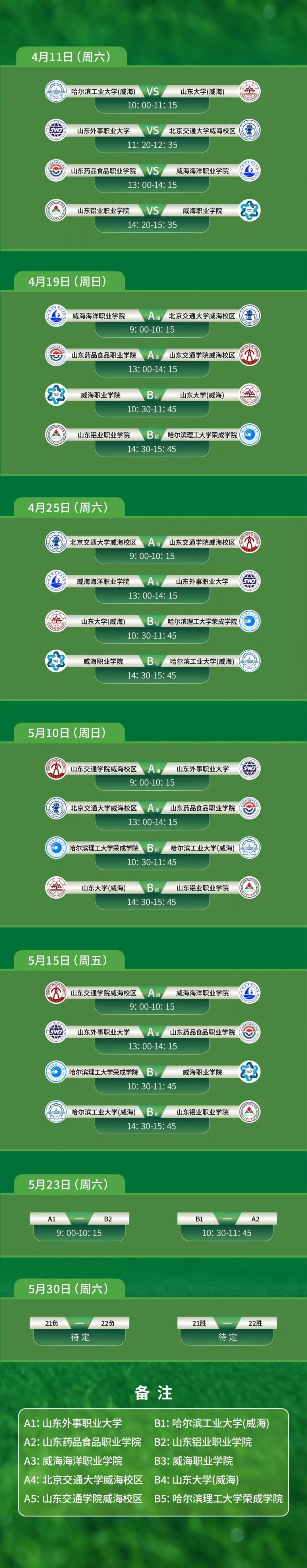威海市大学生足球联赛自2024年开赛,至今已是第三届。本届参与比赛的10所高校分别是:山东大学(威海)、哈尔滨工业大学(威海)、北京交通大学威海校区、哈尔滨理工大学荣成学院、山东交通学院威海校区、山东外事职业大学、威海职业学院、山东药品食品职业学院、威海海洋职业学院、山东铝业职业学院。