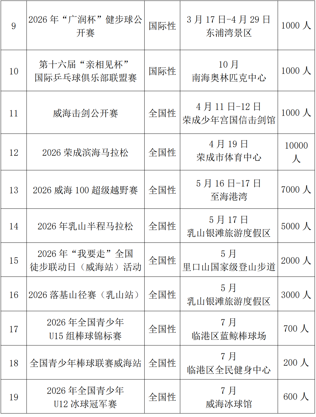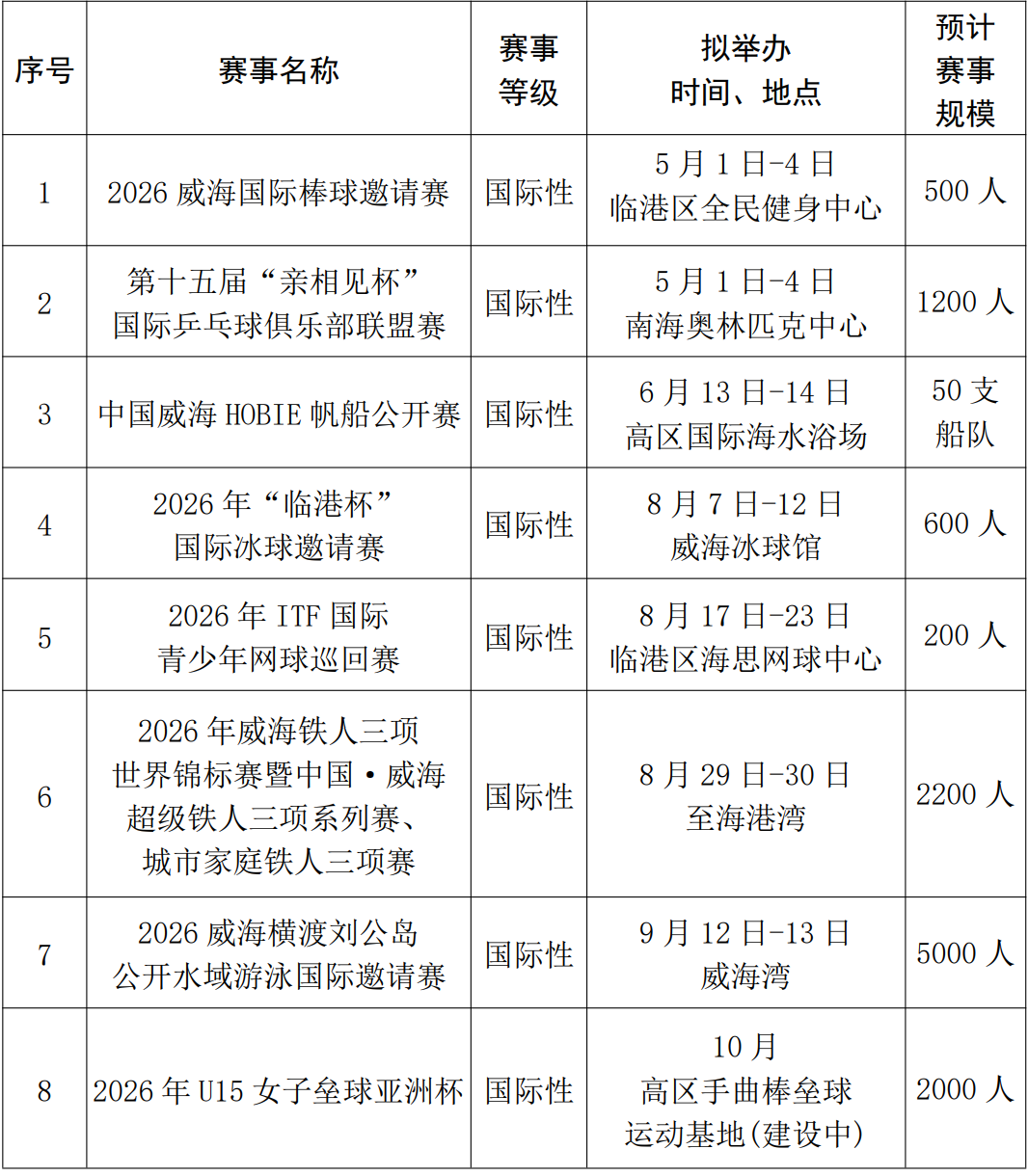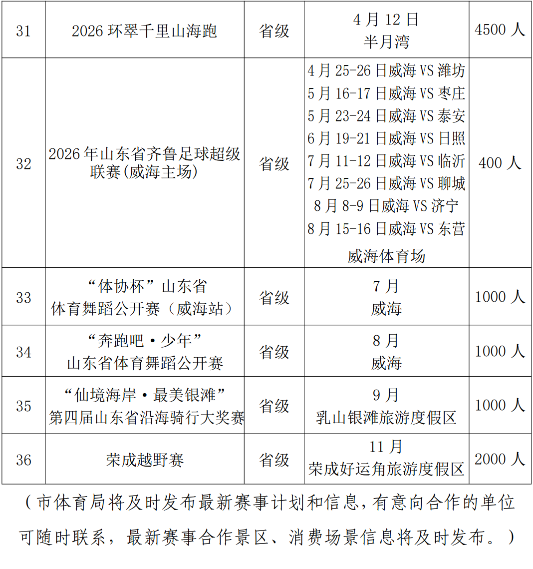 为发展赛事经济、促进体育消费,2026年威海市计划举办200余项大型体育赛事活动,其中,威海铁人三项赛、威海100超级越野、威海半程马拉松、横渡刘公岛公开水域游泳等赛事突显赛事规模大、市外参赛人员占比高、赛事消费力显著等特点。为给广大商家和消费者搭建共赢平台,市体育局、市商务局、市文化和旅游局联合推出2026年度“跟着体育赛事去旅行”活动,共征集了73个合作景区、商家、消费场景,可向赛会人员提供消费优惠。现公告如下。