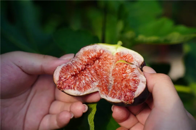 “成熟的果子,颜色要呈紫红色,手感微软,闻起来有清香味,果尾微微开裂,这样的甜度最高、口感最好。”石海霞一边说着,一边轻摘下一颗果实,熟练地掰开。只见鲜艳的红色果心软糯流蜜,晶莹的果蜜仿佛随时要滴落下来,让人垂涎欲滴。“别看我今年是头一回种无花果,我可是种了10多年草莓的‘老把式’了,管理起来得心应手。”