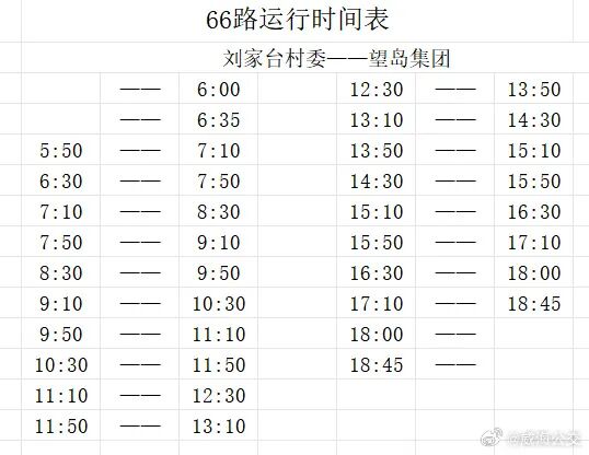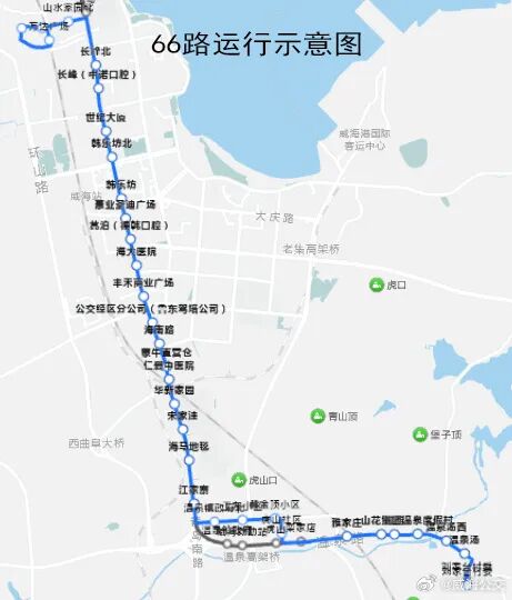 新开通的66路公交由望岛集团发车,途经望岛路、望海街、仙姑顶路、统一南路、望岛路、青岛北路、青岛中路、青岛南路、江家寨立交桥、工友路、虎山路、温泉路、301省道、五峰路至刘家台村委站。