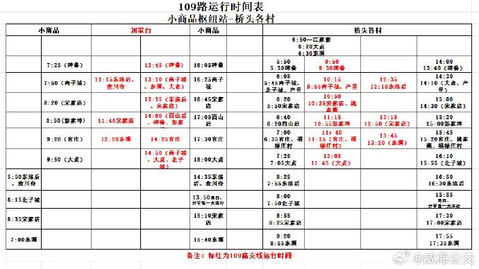 新开通109路支线运行时间:刘家台村委11:15—14:50,桥头枢纽站9:50—13:45。运行期间,票价执行普通线路票制票价,线路等级为三级,享受优惠换乘政策。