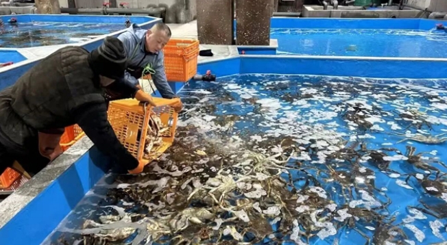 4月8日14时许,在位于山东润泽冷链物流基地的10号暂养区,工作人员正忙着将刚从港口转运至此的蓝帝王蟹逐一入池“静养”。这批货物主要用于保障“五一”节日市场供应,根据客户需求进行短期暂养,等待提货。