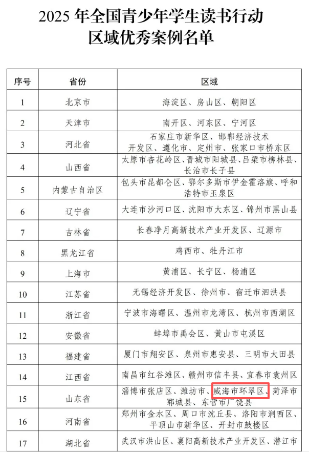 近日,教育部公布2025年全国青少年学生读书行动区域优秀案例名单。其中,山东省5个区域申报的优秀案例成功入选,威海市环翠区入选。