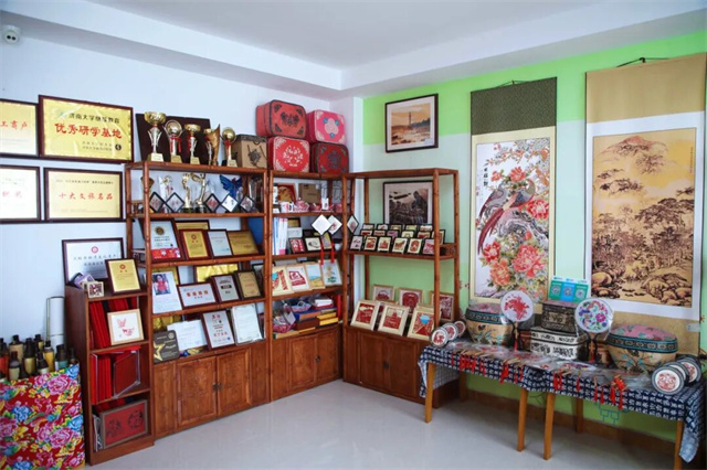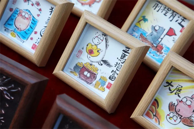 有十二生肖的漫画、手造盘扣、铜版画、刻画葫芦等等,都是独具威海特色的非遗手工作品。