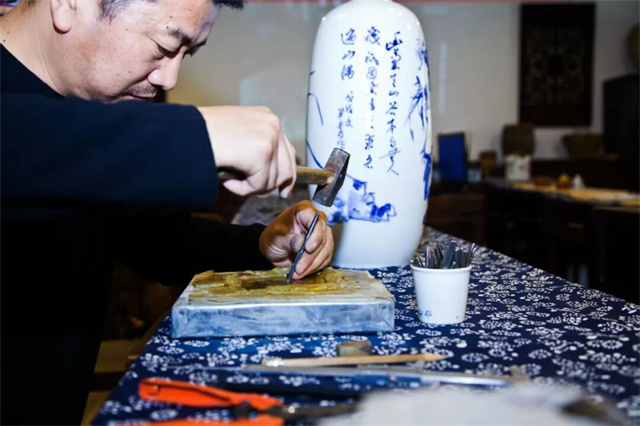 耿海胜不光自己手艺好,还出了本书叫《且钉一璺》,把本事都写进去,生怕传丢了。在他的吉呈轩工作室里,大大小小的工具挂满一墙面,做好的成品更是不拘一格放的到处都是,你可以亲手敲个小铜版,或者试着锔补一片小瓷片。
