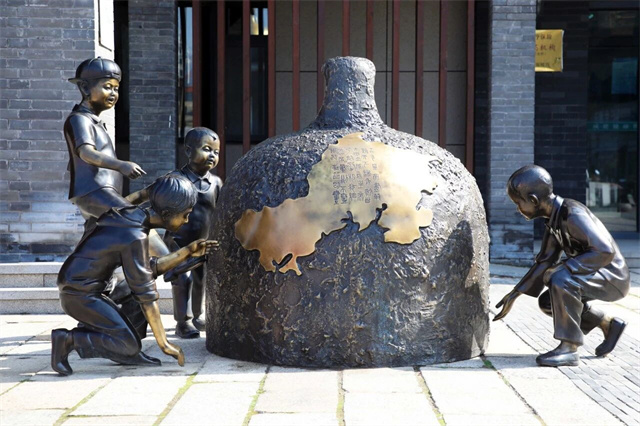 往街巷深处走,还散落着许多复刻老威海生活的小铜人:玩弹珠、摔泥巴、拔萝卜的孩童、爆爆米花的老爷爷……栩栩如生,重现着80后的童年日常,谁的童年里不曾有过这么一群走街串巷的小伙伴。