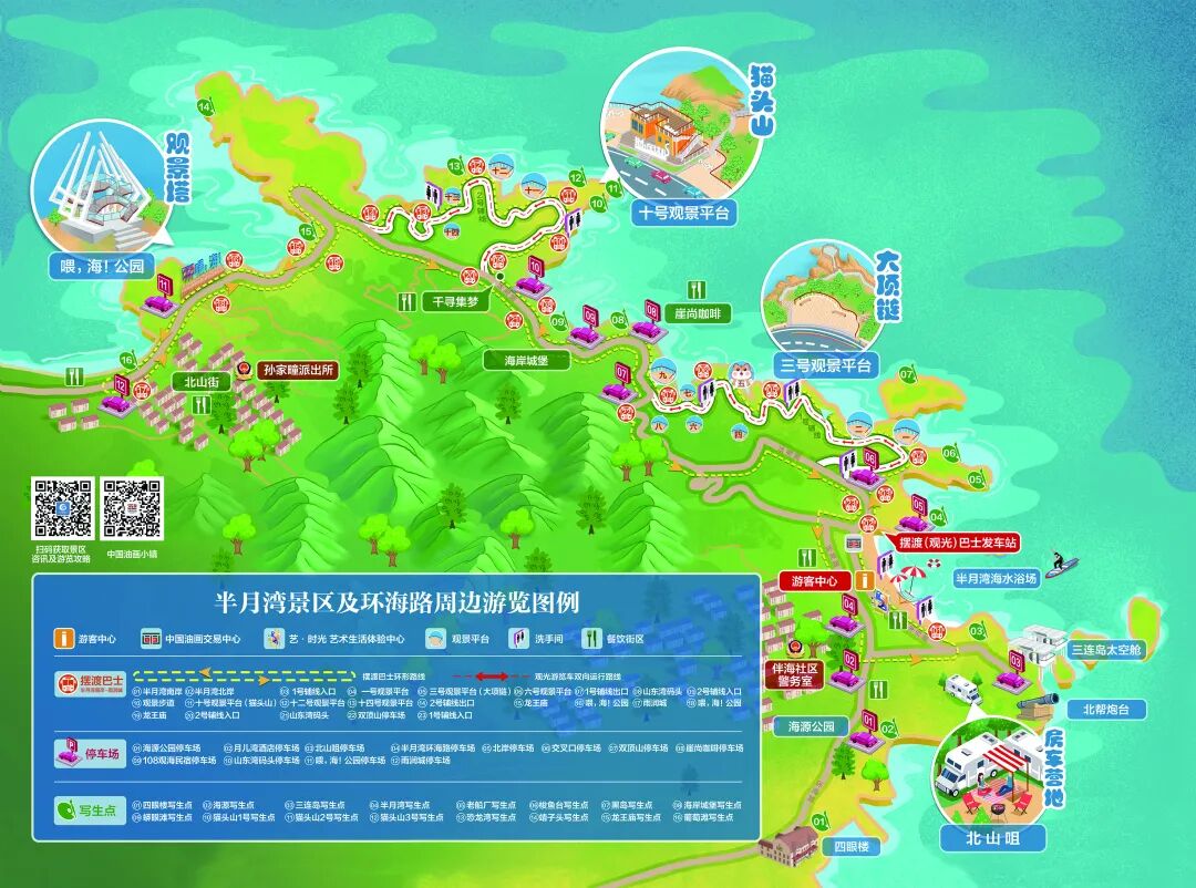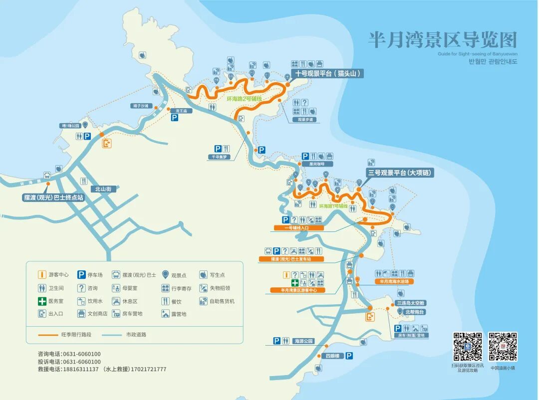 如果您自驾前来游玩景区,停车完全不用担心。像半月湾北岸、南岸北山咀、半月路商户门前停车场、交叉口停车场、半月湾环海路两侧停车场、双顶山停车场、山东湾码头停车场、喂,海!公园、雨润城、海源公园等停车区域,都能满足您的停车需求。