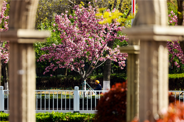 芳菲四月,高区“樱花大道”世昌大道迎来一年中最动人的盛景,道路两侧行车绿化隔离带内,上千余株早樱、晚樱次第开放,粉白花瓣如云似霞,在春风里铺成一条流动的浪漫花廊。而在春风里生活小区路段南侧,一株被誉为“樱花界大熊猫”的珍稀绿樱正悄然绽放,在成片的粉色晚樱中格外醒目,宛如枝头缀落的翡翠,在春日暖阳下熠熠生辉。