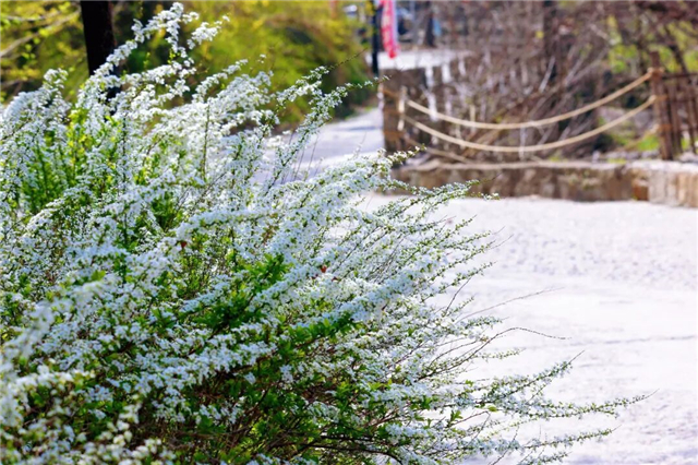 遍地的芝樱花沿着坡地铺展开来,一直延伸到茶园深处。木栈道两侧,雪柳开得正盛,细碎的白花缀满枝桠,像一场温柔的春日雪。