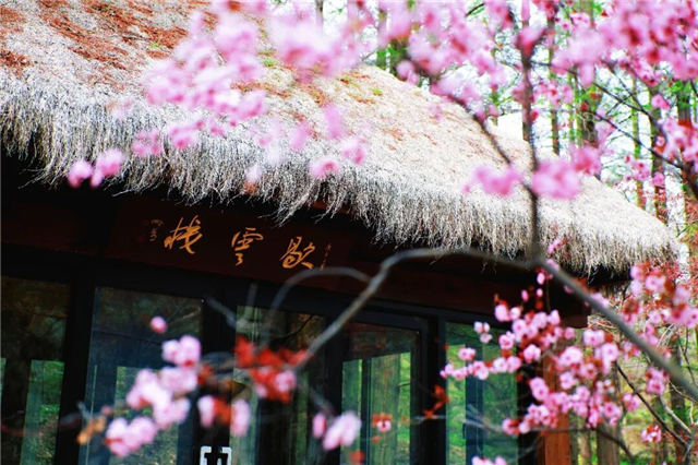 茶园种了一大片桃树,桃花正值盛放期,如粉色云霞般笼罩山峦。透过朦胧的花影,能看见茶园的中式建筑隐在粉白的花团中,自带氛围感。