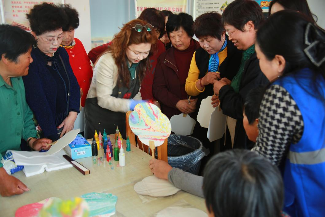 实操过程中,老师手把手耐心指导,教大家将扇子轻轻插入水中,缓慢转动扇柄,让扇面均匀接触水中颜料。大家全神贯注、屏住呼吸,跟着节奏认真操作,看着原本素净的扇面,渐渐晕染出色彩斑斓的鲜艳纹路。“太神奇了!我选了喜欢的蓝色,转的时候又紧张又期待,亲手做的,太好看了,我可得好好珍藏着!”刘女士举着自己的作品,脸上满是欢喜与自豪。