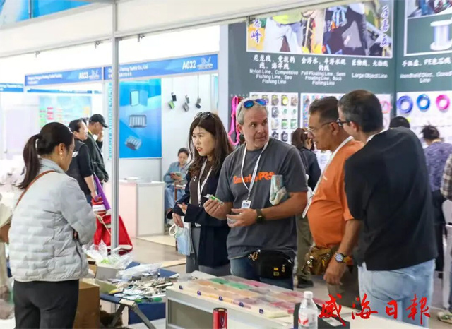 走进E5馆渔具展区,威海龙博纳金属科技有限公司的展位格外吸睛。展位展板上陈列着各式仿生饵,金枪鱼系列、硬饵系列等产品色彩丰富、款式多样。企业负责人姜天龙介绍:“我们主打金枪鱼专用仿生饵,产品主要销往中东、欧美地区,希望借助本次展会对接更多采购商,拓展合作、提升订单量。”不远处的启鳞钓鱼服(威海)展位上很是热闹,工作人员正通过直播推介钓鱼防晒衣,线上线下联动推广,氛围十分火热。