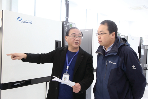王志勇(左)和阅芯首席技术官张文亮一起探讨生产车间布局。 通讯员 李振宇 摄